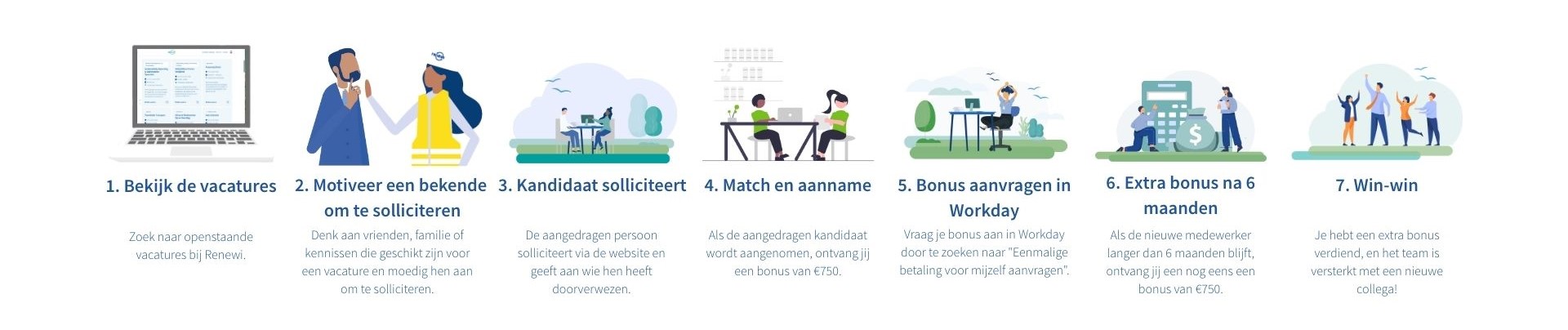 Al deze vacatures zijn beschikbaar voor referrals. Wanneer jouw vriend, vriendin, kennis of familielid een goede match zou kunnen zijn voor een bepaalde vacature, kun je hem of haar motiveren om te solliciteren via onze website. Bij de sollicitatie moet diegene aangeven door welke Renewi medewerker hij of zij is aangedragen. Zodra er een match is en jouw vriend, vriendin, kennis of familielid is aangenomen, kun je aanspraak maken op een mooie bruto bonus van €750,-